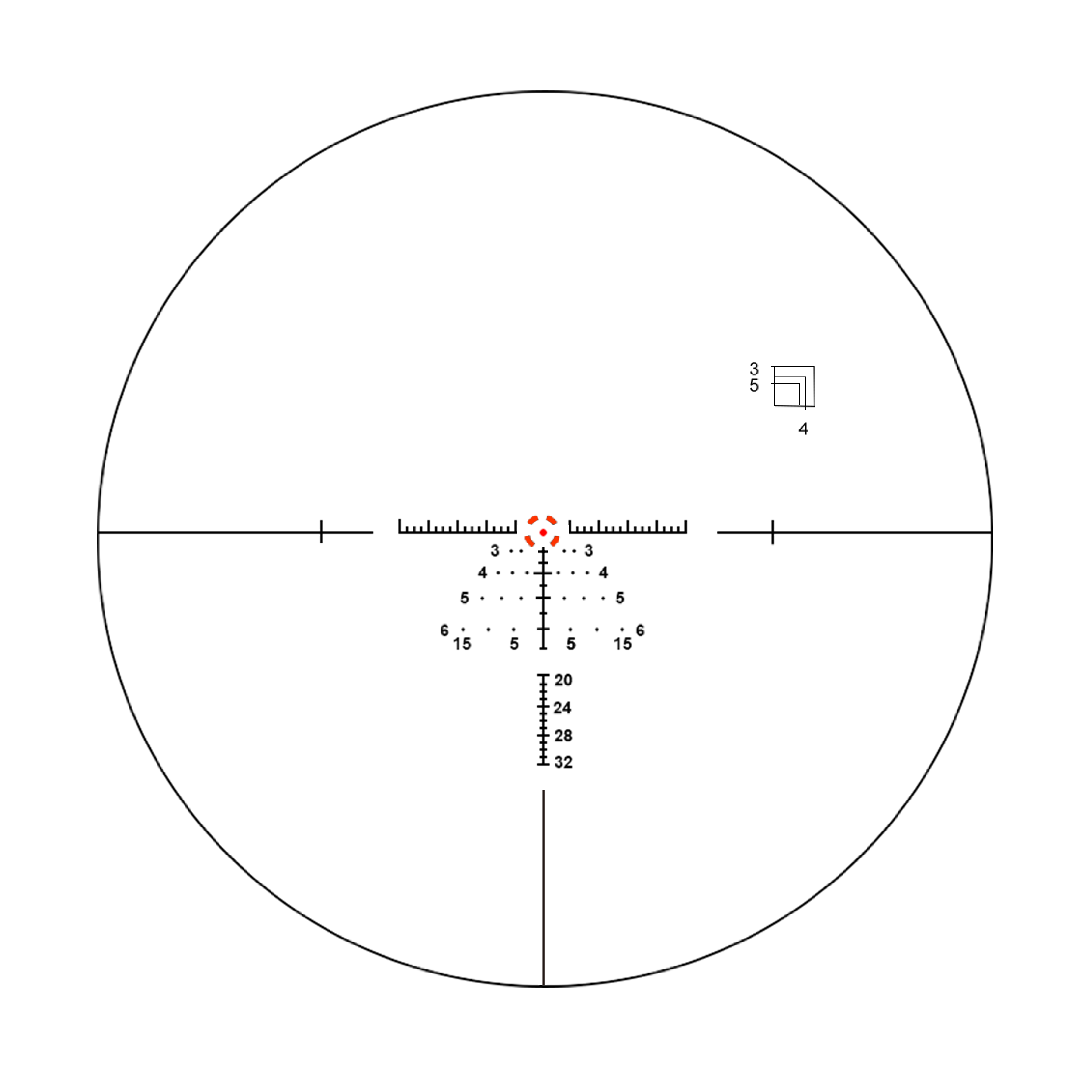 Designed by the professional shooters based on 5.56 calibre, MOA + Custom Rangefinding BDC Reticle with wind holds (MRB-W) and scope systems provide high speed target acquisition with uncompromising quality and durability for shooters who need to engage targets from point-blank out to extended ranges. It features a 1MOA dot surrounded by a 4-MOA circle. Each small grid 1 MOA on the horizontal stadia. Rangefinding features with the squares in the upper right can be used for Rangefinding and it measures a custom height/width of 46cm (18”) from 300-500 meters. A 0.5 MOA Windage holds points to make it ideal for any setting from open desert to heavy cover and urban environments.