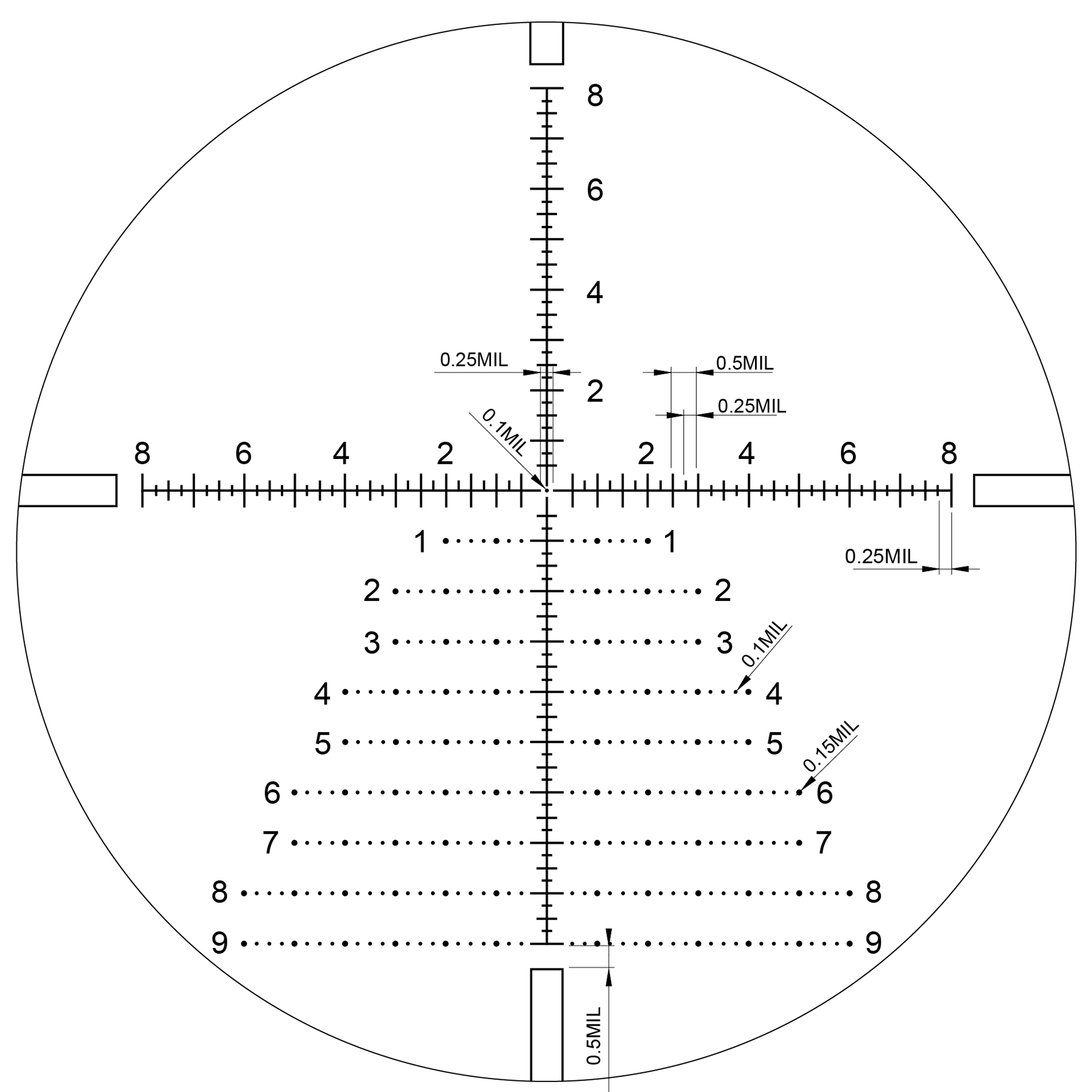 Designed by the professional shooters, combines passive rangefinding with MIL Dot marks for estimating holdover up to 17 milliradians (mrad or mils) at vertical line and 16 milliradians at horizontal line. Using this passive rangefinder with the known ballistics of the weapon makes for quick, accurate shots.