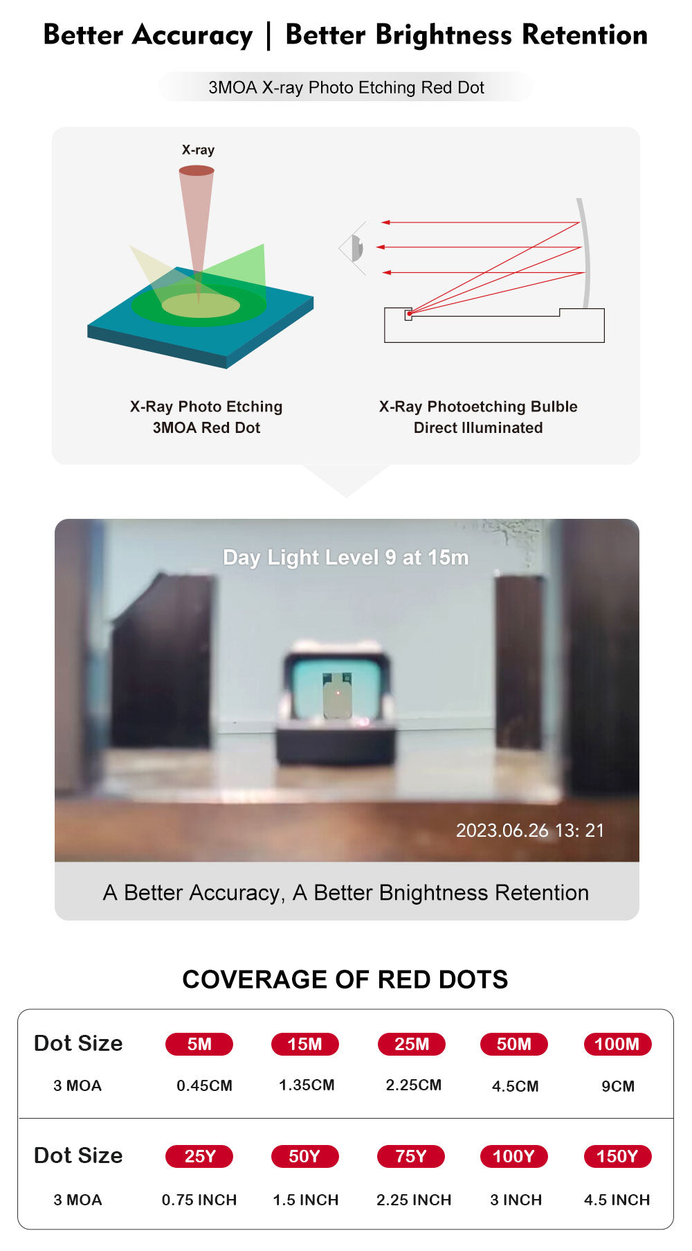 [ 3 MOA X-ray Photo Etching Red Dot ] 3 MOA X-ray Photo Etching Red dot brings a better accuracy, better brightness retention and power saving. Battery Life Up to 50000 Hours at the Lowest Set.