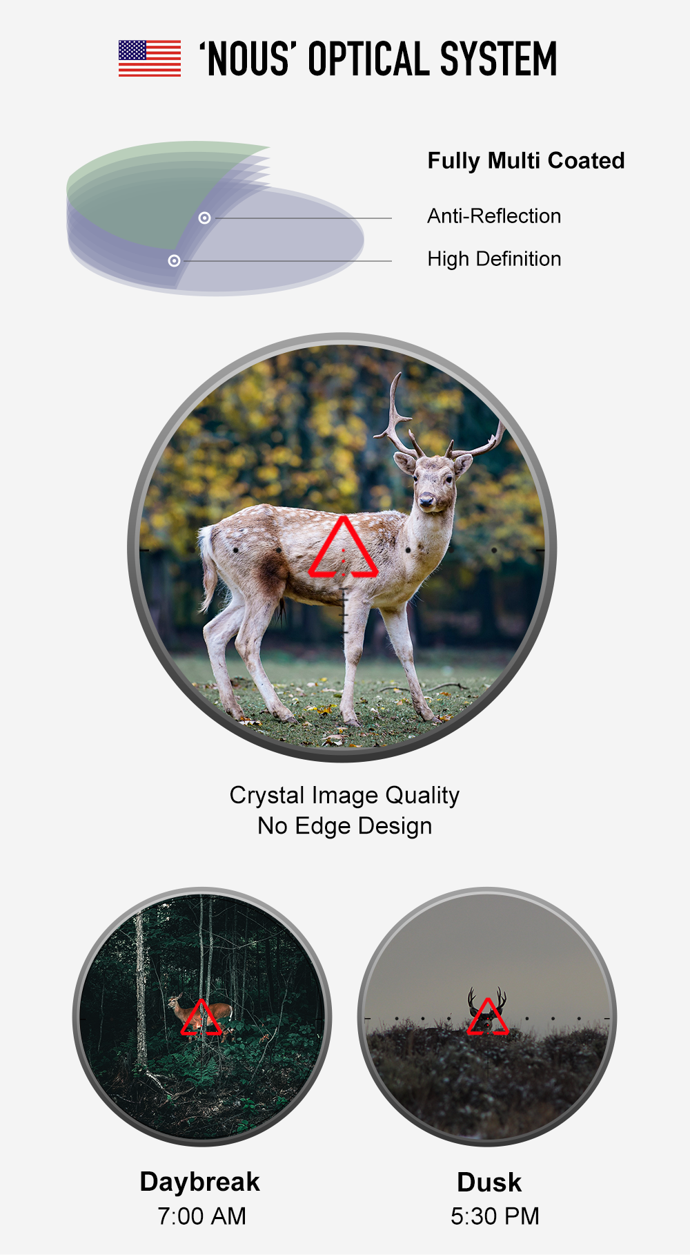 Advanced ‘Nous’ optical system is accomplished for Super Wide Field of view. ‘Nous’ optical system is originally designed in USA. Superior lenses are fully coated with Multi-layer Broad Band Anti-reflective Coatings which ensure maximum light transmission and exceptional clarity. Incredible bright and sharp image will build your confidence in poor light condition from daybreak to dusk