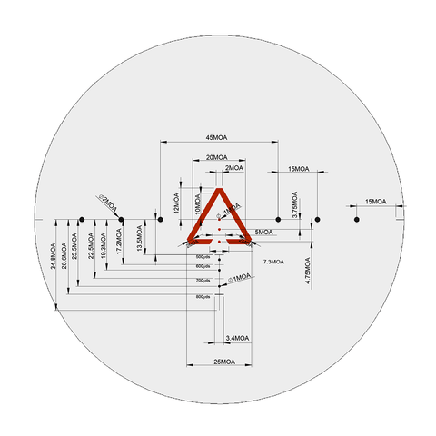Delta Wing Reticle is designed for 5.56 calibre by Shooting Enthusiast. It features Three 1 MOA dot surrounded by a tactical equilateral triangle with a trapezoidal exit ( here we call Delta Wing ). The inside length of the equilateral triangle is 20 MOA and the outside length of 25 MOA. Which is designed for target measuring in different angle. The length of the upper side of the trapezoid is 5MOA, and the length of the lower side is 7.3MOA. BDC features with each dot on the vertical line from 100yds, 300yds, 400yds, 500yds, 600yds, 700yds, 800yds. The distance between 2 dots on the side of the equilateral triangle is 15MOA.