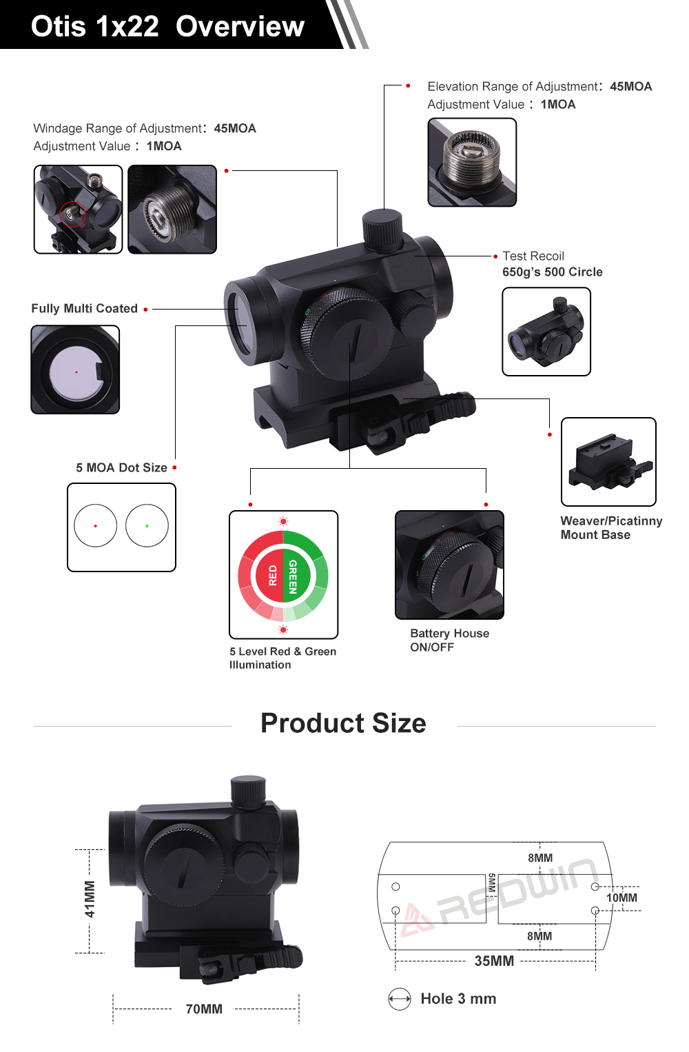 Red Win Otis 1x22 5 MOA Red Dot Scope Cap Adjust 5 level R/G Illumination w/ Picatinny Riser Mount fit for AR Platform .223 .308