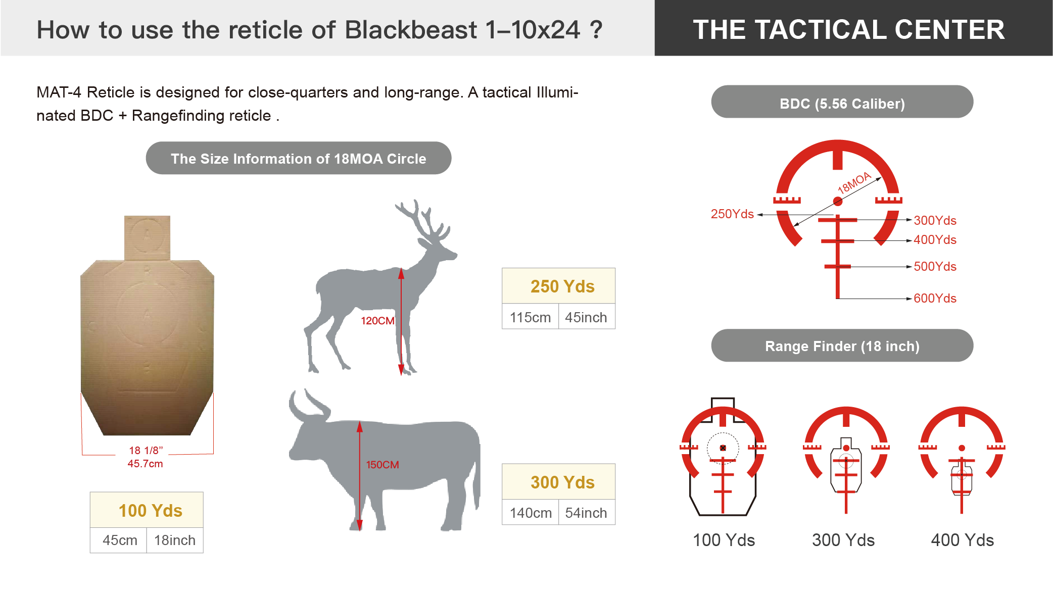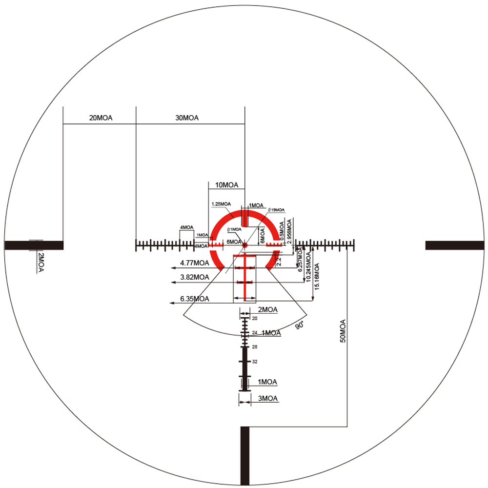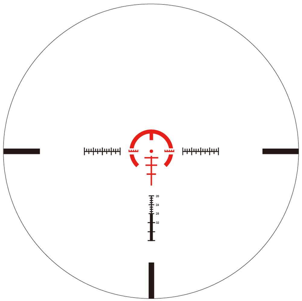 MAT-4 Reticle is designed for close-quarters and long-range. A tactical Illuminated BDC + Rangefinding reticle equipped with a quick acquisition 18MOA-19 MOA Circle and a 1 MOA Target Aiming Dot. The Illuminated BDC is designed for 5.56 caliber at 250 yds – 550 yds. Rangfinding features with horizontal line under the target aiming dot and it measures a custom height/width of 45cm (18”) from 300-500 meters. The extra MOA grade on the horizontal and vertical line is an idea for long range shooting (1MOA/small grade, 4MOA/big grade).
