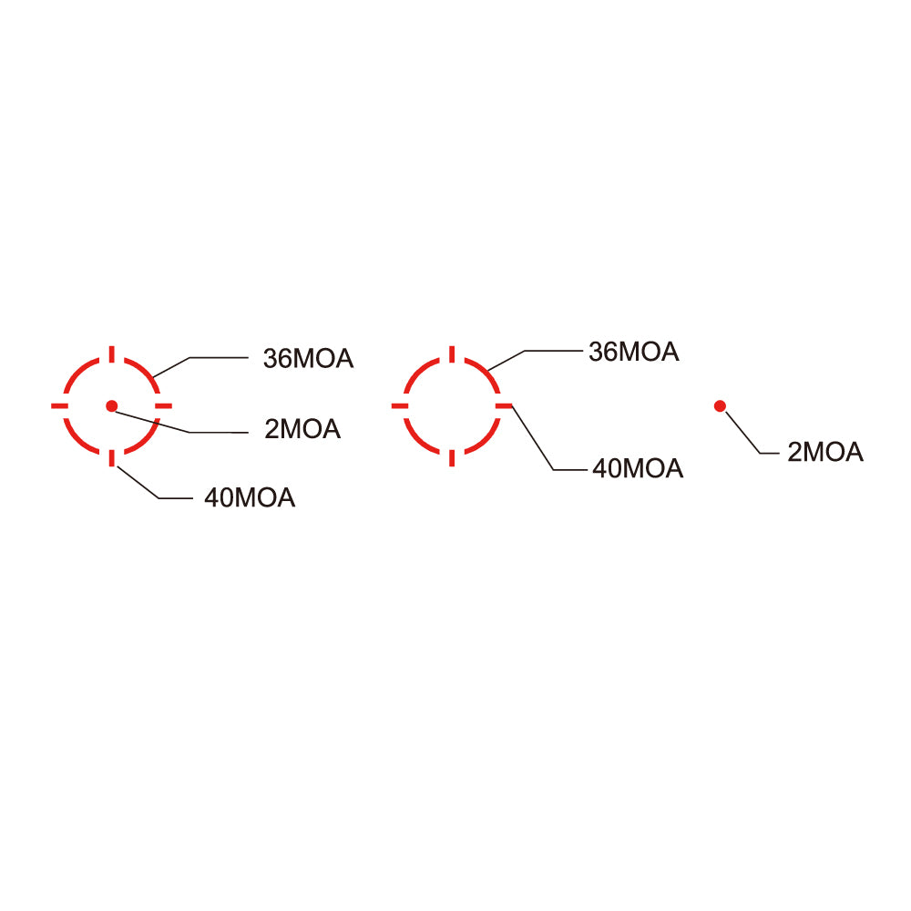 レチクルタイプ: 2 MOA ドット、36 MOA サークル、40 MOA クロスヘア ドット + サークル