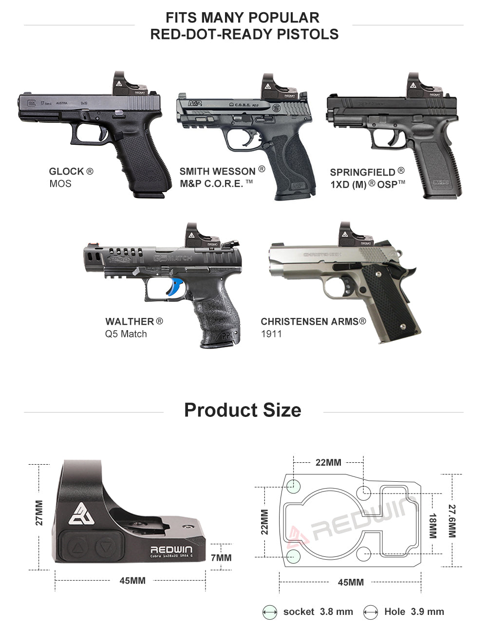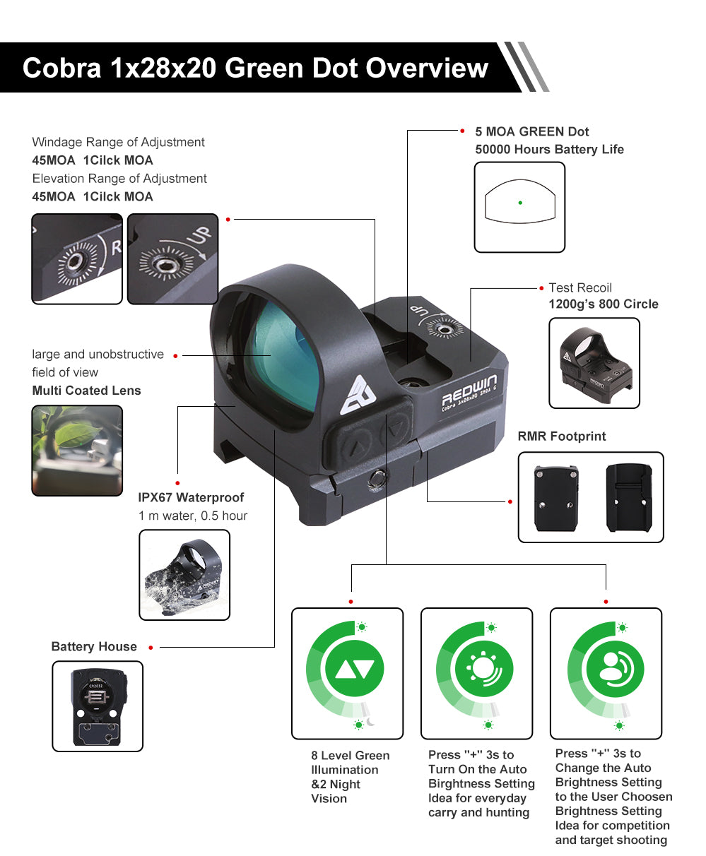 Red Win HD Cobra 1x28x20 5MOA グリーン ドット スコープ RMR 50000 時間 自動光感知ピストル コリメーター サイト、GLOCK 17 19 9mm AR15 M4 に適合。