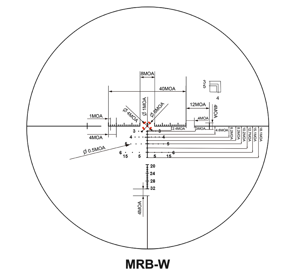 プロの射手によって設計された、5.56口径、MOA + カスタム距離測定 BDC レチクルと風保持機能 (MRB-W)、およびスコープ システムに基づいて、至近距離から遠距離までターゲットを狙う射手にとって妥協のない品質と耐久性を備えた高速ターゲット捕捉を提供します。4 MOA の円で囲まれた 1MOA のドットが特徴です。各小さなグリッドは水平スタジアムで 1 MOA です。右上の四角形を使用した距離測定機能は距離測定に使用でき、300~500 メートルで 46cm (18 インチ) のカスタム高さ/幅を測定します。0.5 MOA の風圧はポイントを保持し、開けた砂漠から密集したカバーや都市環境まで、あらゆる設定に最適です。