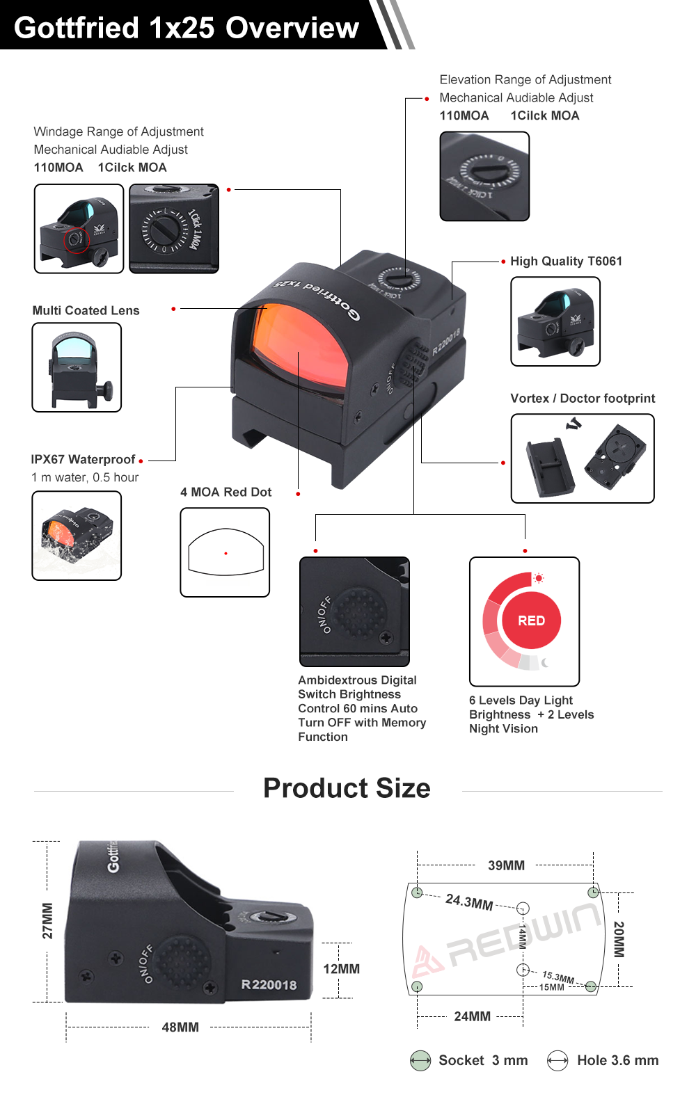 Red Win IPX6 4MOA レッド ドット メカニカル調整、60 分自動オフ、8 レベル赤色照明、Gottfried 1x25 レッド ドット リフレックス サイト。