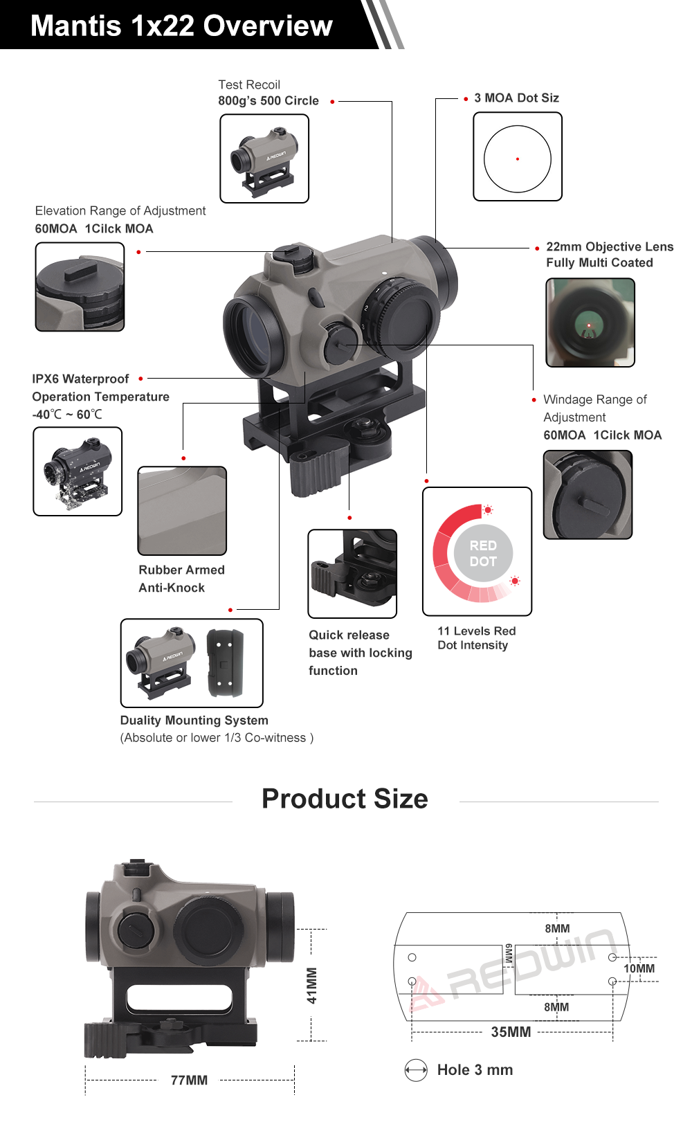 レッド ウィン マンティス 1x22 3MOA ラバーアーム 11 レベル レッド、ピカティニー ライザー マウント下部 1/3 コウィットネス ピカティニー AR15 レッド ドット サイト付き。