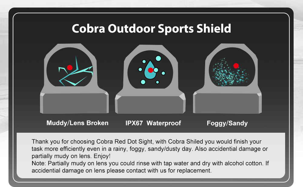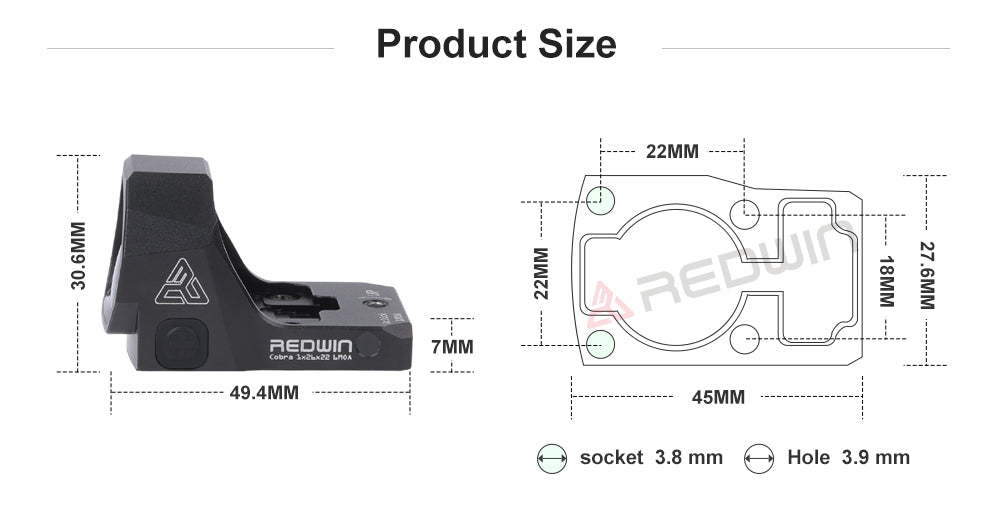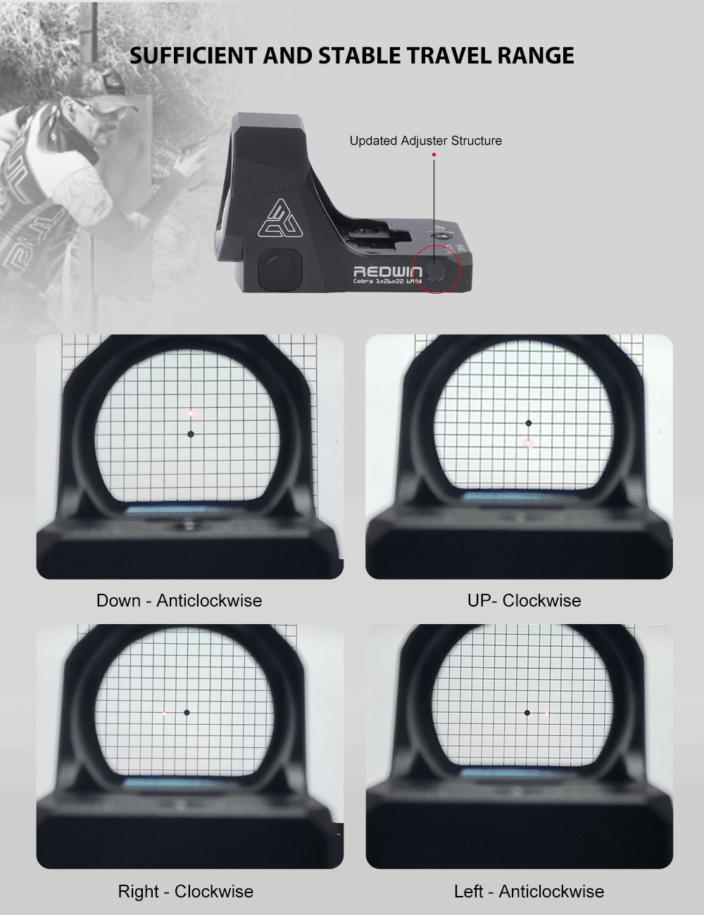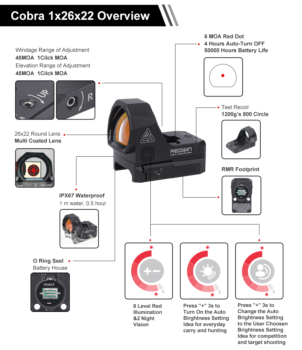 - 최대 50,000시간의 배터리 수명. 6 MOA 도트 크기, 8레벨 빨간색 조명, 햇빛에서도 도트가 보입니다. 야간 시야에 적합한 2단계 추가 저조도 밝기.