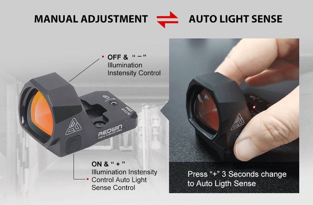 - 실내 및 실외 촬영 환경 간 전환에 적합한 지능형 자동 조명 감지 시스템. 레드 도트 레벨을 수동으로 조정하려면 "+"를 3초 동안 누르세요.