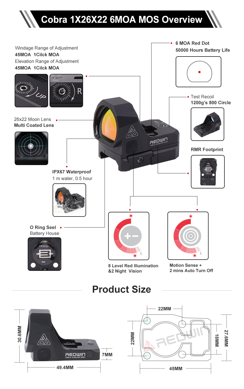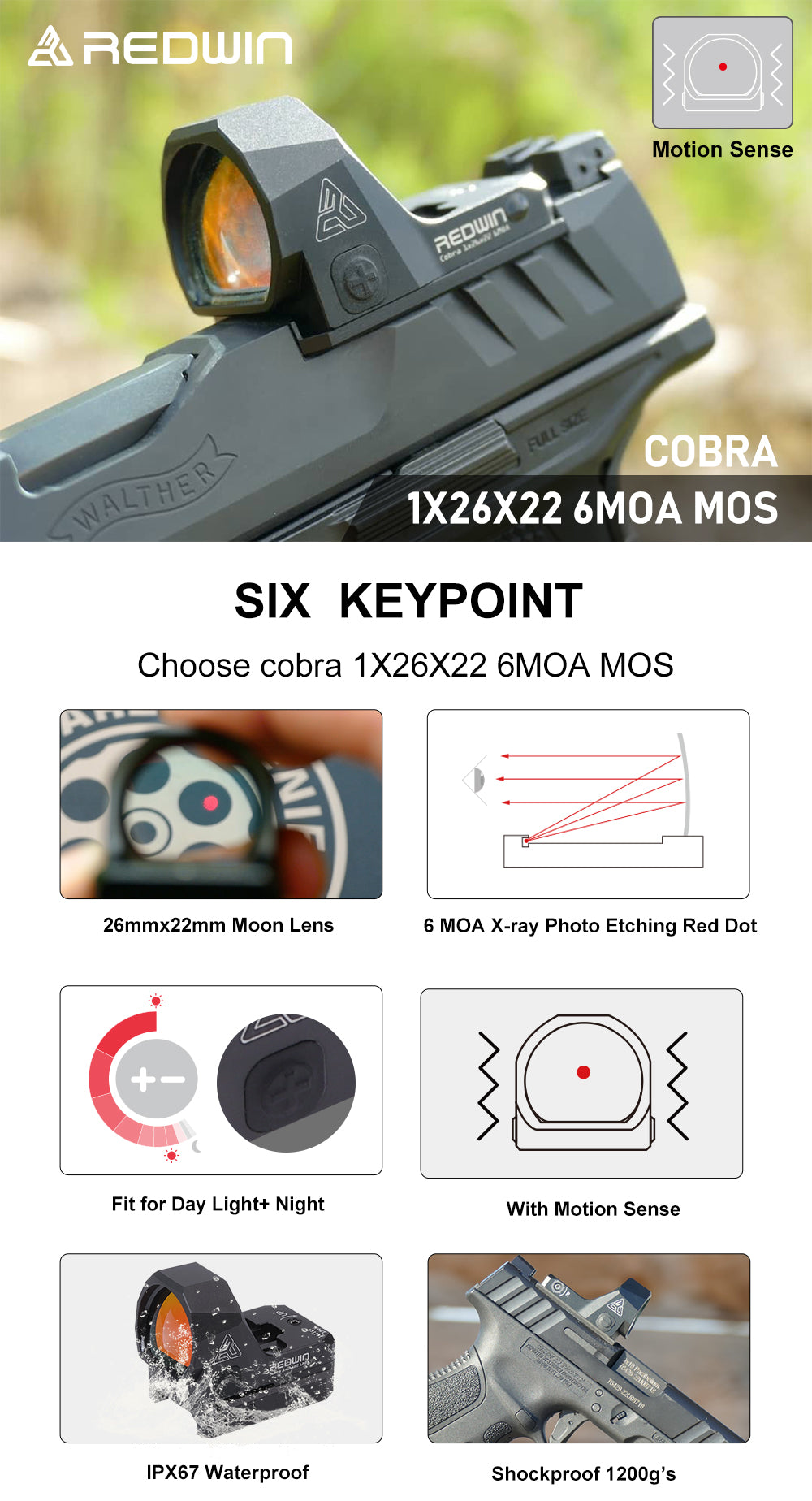 레드 윈 HD 코브라 1x26x22 6MOA RMR 레드 닷 사이트 문 렌즈 50000시간 흔들어 깨우기 2분 자동 차단 글록 9mm용 권총 레드 닷.