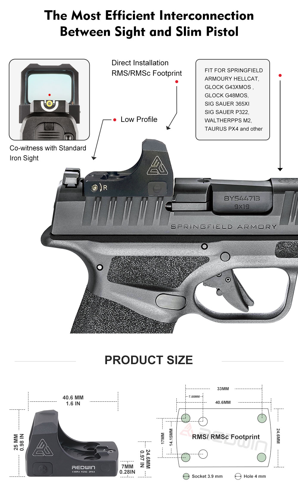 [ 조준경과 슬림권총의 가장 효율적인 상호연결 ] Cobra Mini는 가장 인기 있는 슬림 권총에 직접 설치할 수 있는 RMS/RMSc 설치 공간으로 제작되었습니다.