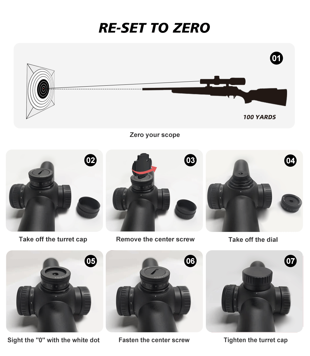 • Reliable 1/2 MOA Cap Adjust, 40 MOA a Round, Total Travel 120 MOA.