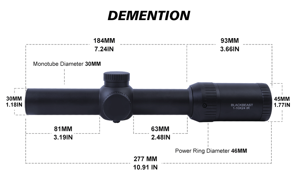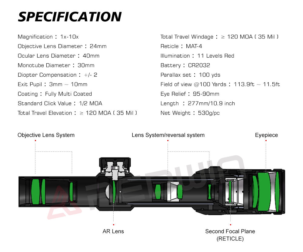 • Premium Optical System Real 10x (1x-10x) Scope.