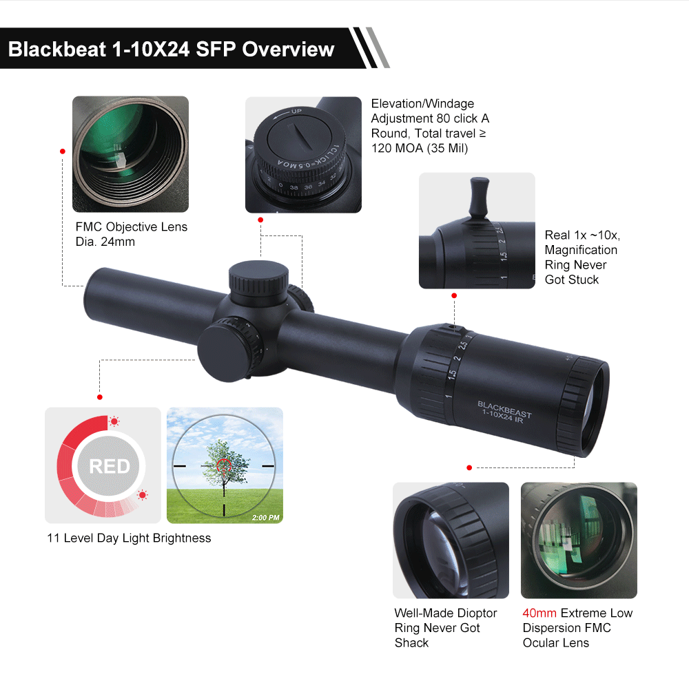 Red Win Blackbeast 1-10x24 IR LPVO Scope Wilder F.O.V. Extrem Low Dispersion 11 Level IR Tactical BDC Rangefinding Reticle For Hunting